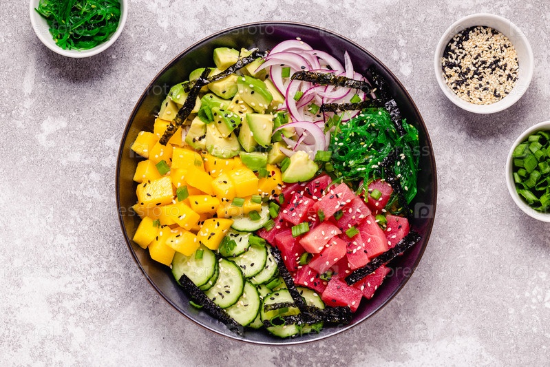Гавайская поке из тунца с водорослями, авокадо, манго, огурцом