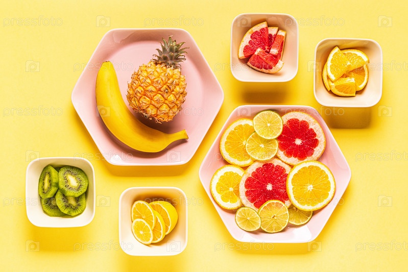 Тропические фрукты целиком и кусочки на тарелках