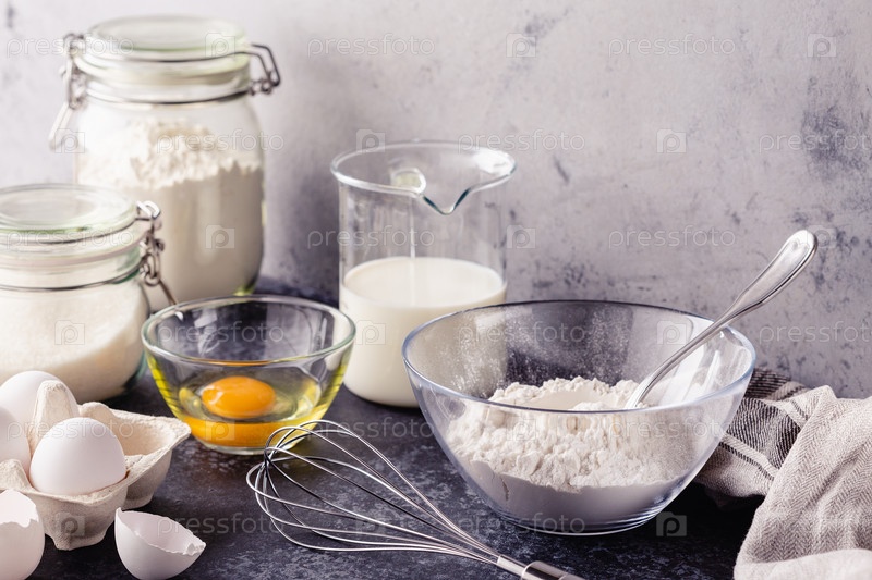 Ингредиенты для приготовления теста, яиц, муки, сахара, молока