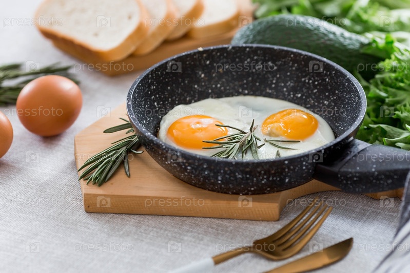 Жареные яйца в сковороде с розмарином, хлебом, яйцами и зеленым салатом на льняной скатерти. Завтрак обед и ужин. Взгляд мягкий, выборочный фокус. Деревенский стиль