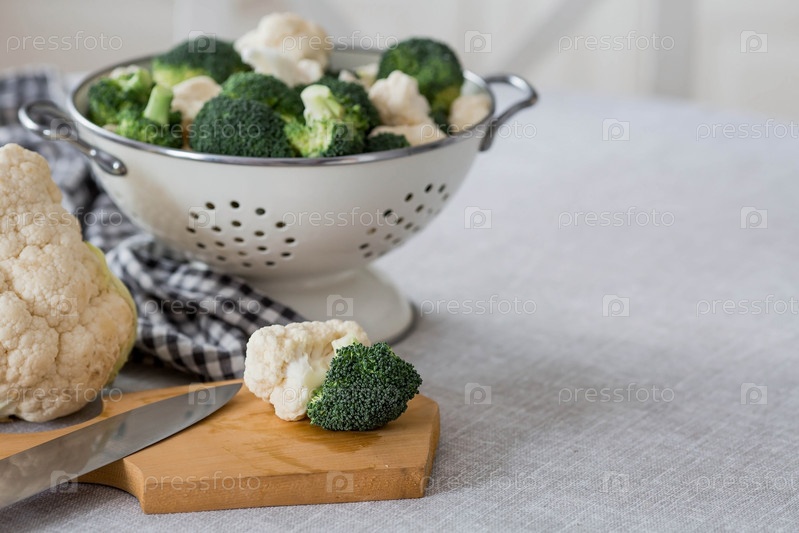 Свежая зеленая брокколи и цветная капуста на деревянной разделочной доске на льняной скатерти. Капустные листья брокколи. Светлый фон. Вегетарианская еда. Здоровый образ жизни