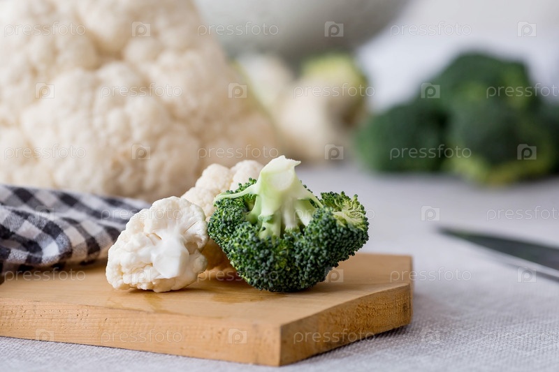 Свежая зеленая брокколи и цветная капуста на деревянной разделочной доске на льняной скатерти. Капустные листья брокколи. Светлый фон. Вегетарианская еда. Здоровый образ жизни