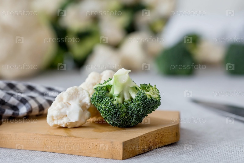 Свежая зеленая брокколи и цветная капуста на деревянной разделочной доске на льняной скатерти. Капустные листья брокколи. Светлый фон. Вегетарианская еда. Здоровый образ жизни