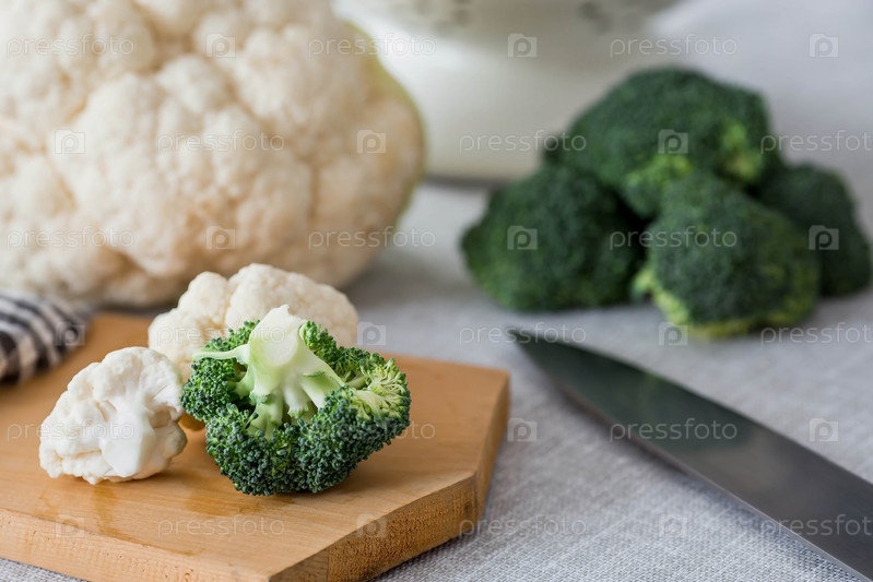 Свежая зеленая брокколи и цветная капуста на деревянной разделочной доске на льняной скатерти. Капустные листья брокколи. Светлый фон. Вегетарианская еда. Здоровый образ жизни