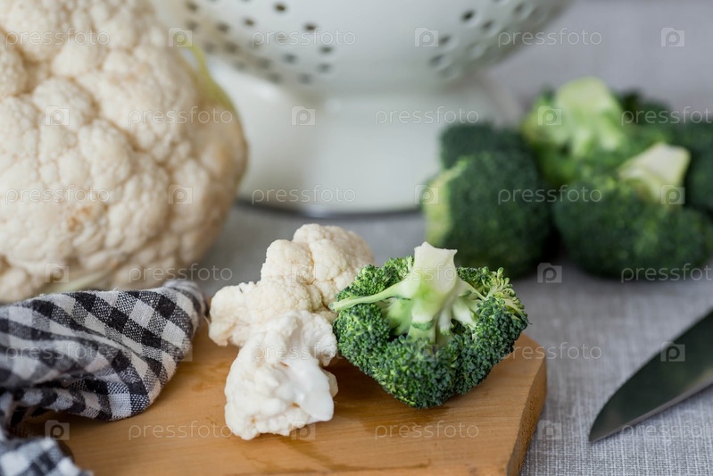 Свежая зеленая брокколи и цветная капуста на деревянной разделочной доске на льняной скатерти. Капустные листья брокколи. Светлый фон. Вегетарианская еда. Здоровый образ жизни
