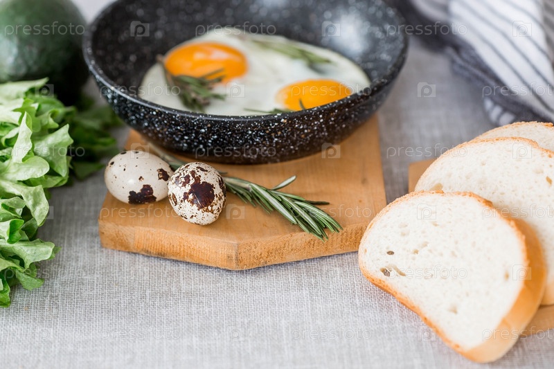 Жареные яйца в сковороде с розмарином, хлебом, яйцами и зеленым салатом на льняной скатерти. Завтрак обед и ужин. Взгляд мягкий, выборочный фокус. Деревенский стиль