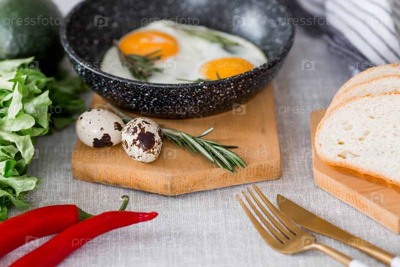 Жареные яйца в сковороде с розмарином, хлебом, яйцами и зеленым салатом на льняной скатерти. Завтрак обед и ужин. Взгляд мягкий, выборочный фокус. Деревенский стиль