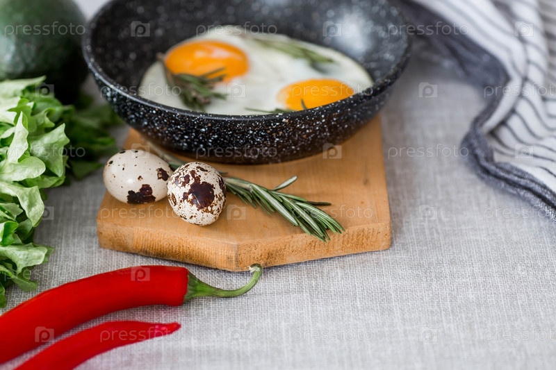 Жареные яйца в сковороде с розмарином, хлебом, яйцами и зеленым салатом на льняной скатерти. Завтрак обед и ужин. Взгляд мягкий, выборочный фокус. Деревенский стиль
