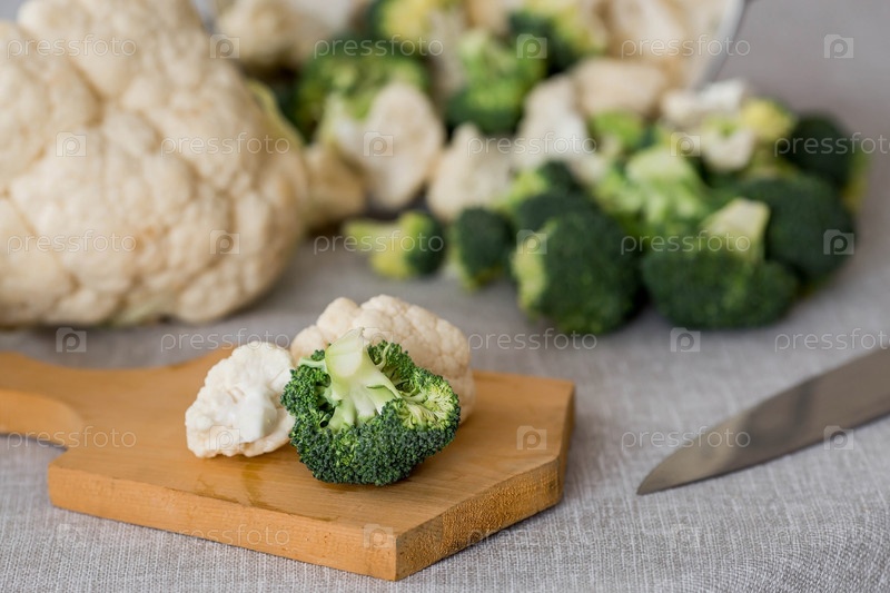 Свежая зеленая брокколи и цветная капуста на деревянной разделочной доске на льняной скатерти. Капустные листья брокколи. Светлый фон. Вегетарианская еда. Здоровый образ жизни