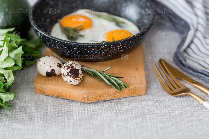 Жареные яйца в сковороде с розмарином, хлебом, яйцами и зеленым салатом на льняной скатерти. Завтрак обед и ужин. Взгляд мягкий, выборочный фокус. Деревенский стиль