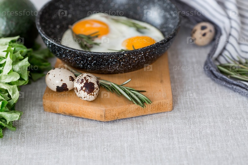 Жареные яйца в сковороде с розмарином, хлебом, яйцами и зеленым салатом на льняной скатерти. Завтрак обед и ужин. Взгляд мягкий, выборочный фокус. Деревенский стиль