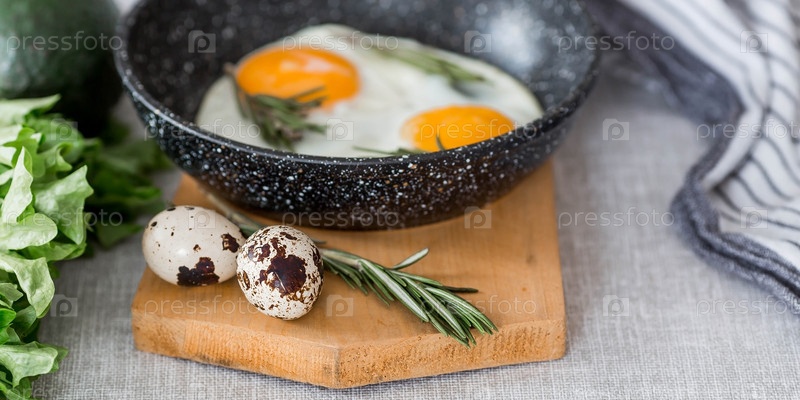 Жареные яйца в сковороде с розмарином, хлебом, яйцами и зеленым салатом на льняной скатерти. Завтрак обед и ужин. Взгляд мягкий, выборочный фокус. Деревенский стиль