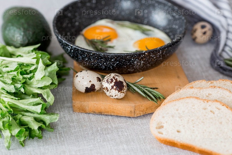 Жареные яйца в сковороде с розмарином, хлебом, яйцами и зеленым салатом на льняной скатерти. Завтрак обед и ужин. Взгляд мягкий, выборочный фокус. Деревенский стиль