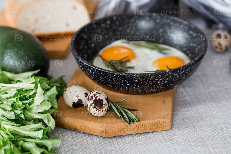 Жареные яйца в сковороде с розмарином, хлебом, яйцами и зеленым салатом на льняной скатерти. Завтрак обед и ужин. Взгляд мягкий, выборочный фокус. Деревенский стиль