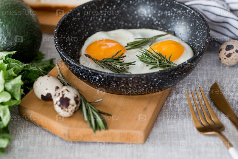 Жареные яйца в сковороде с розмарином, хлебом, яйцами и зеленым салатом на льняной скатерти. Завтрак обед и ужин. Взгляд мягкий, выборочный фокус. Деревенский стиль