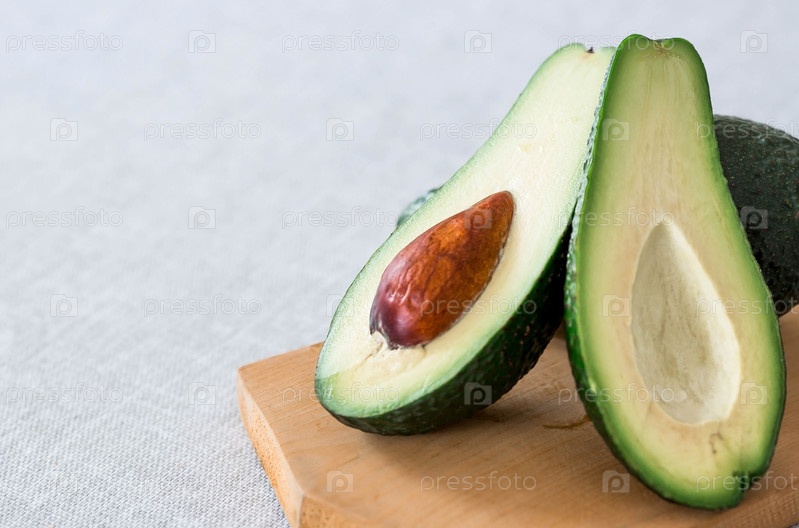 Спелый вкусный авокадо на разделочной доске на льняной скатерти. Крупный план. Светлый фон. Вегетарианская еда. Здоровый образ жизни