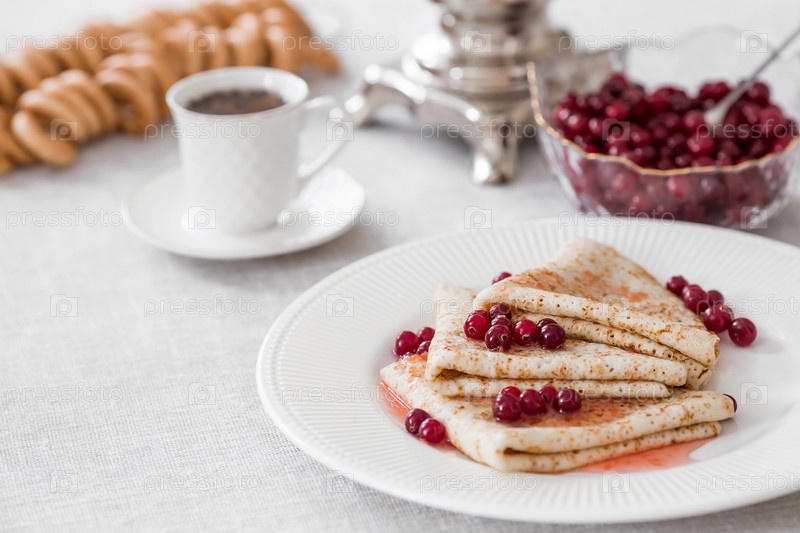 Русские традиции. Русский праздник Масленица. Натюрморт с чашкой чая, стопкой блинов с северной клюквой, кубиками масла и самоварами на столе