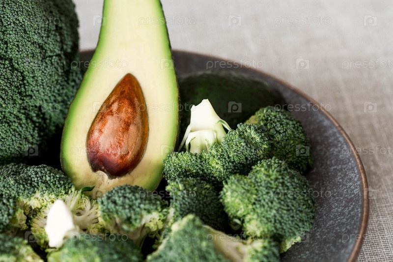 Свежая зеленая брокколи и авокадо на тарелке на льняной скатерти. Капустные листья брокколи. Светлый фон. Вегетарианская еда. Здоровый образ жизни