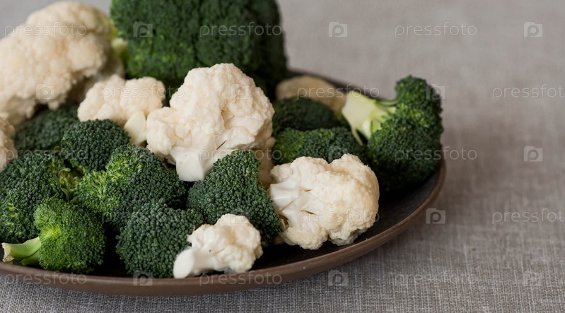 Свежая зеленая брокколи и цветная капуста на тарелке на льняной скатерти. Капустные листья брокколи. Светлый фон. Вегетарианская еда. Здоровый образ жизни