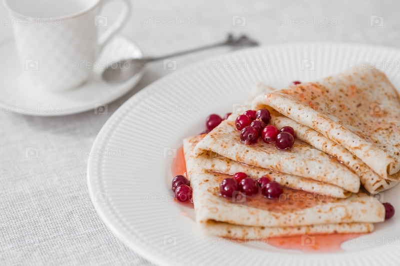 Русские традиции. Русский праздник Масленица. Натюрморт с чашкой чая, стопка блинов с северной клюквой, кубики масла на столе