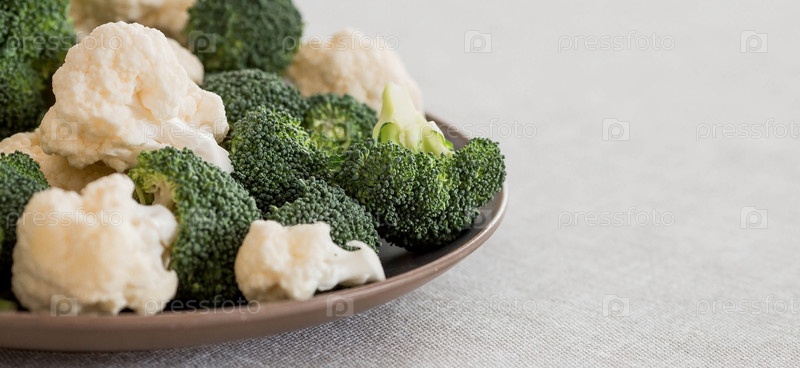 Свежая зеленая брокколи и цветная капуста на тарелке на льняной скатерти. Капустные листья брокколи. Светлый фон. Вегетарианская еда. Здоровый образ жизни