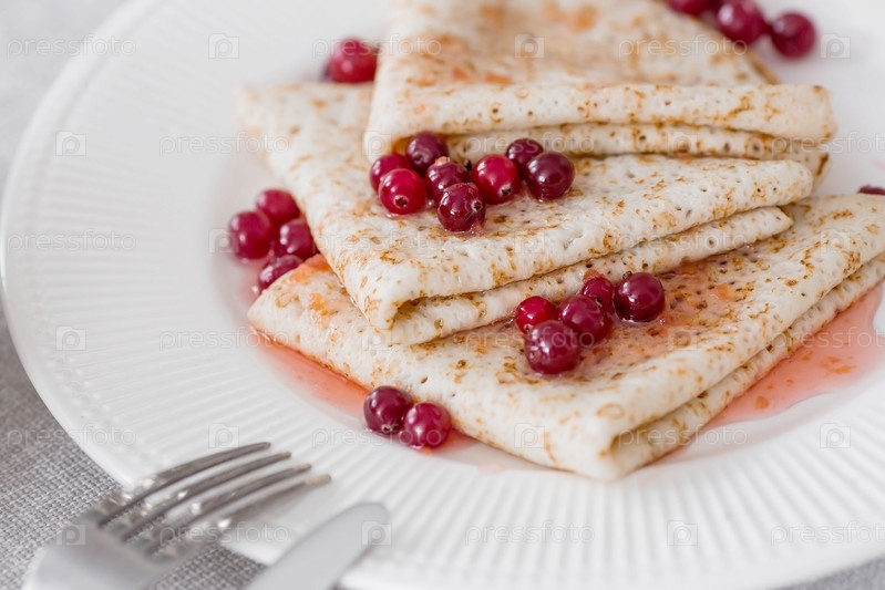 Русские традиции. Русский праздник Масленица. Натюрморт с чашкой чая, стопка блинов с северной клюквой, кубики масла на столе