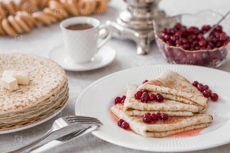 Русские традиции. Русский праздник Масленица. Натюрморт с чашкой чая, стопкой блинов с северной клюквой, кубиками масла и самоварами на столе