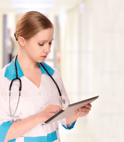 Женщина-врач держит планшетный компьютер