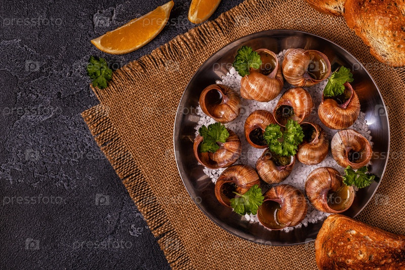 Жареные улитки с лимоном, багетом и петрушкой
