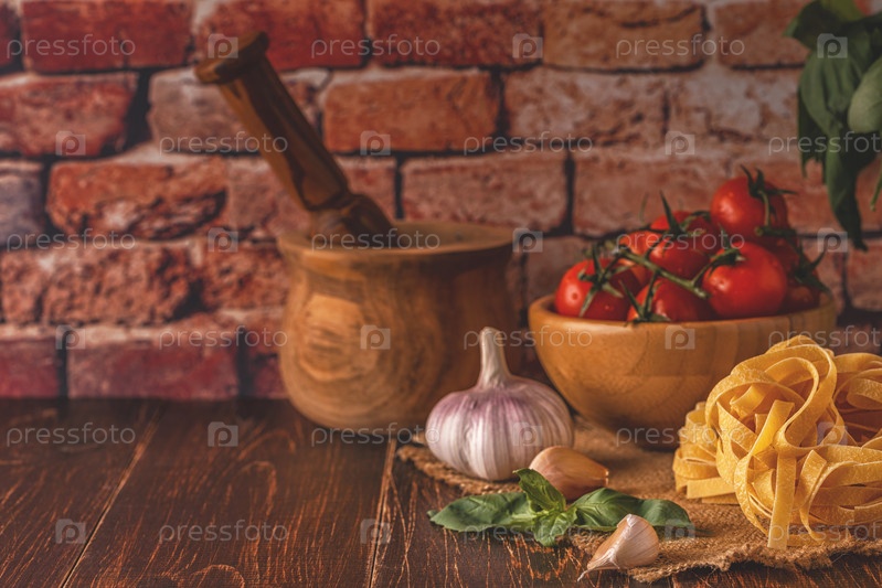 Продукты для приготовления пищи - макароны, помидоры, чеснок, оливковое масло и красное вино