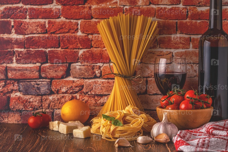 Продукты для приготовления пищи - макароны, помидоры, чеснок, оливковое масло и красное вино
