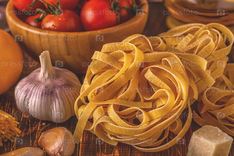 Продукты для приготовления пищи - макароны, помидоры, чеснок, оливковое масло и красное вино
