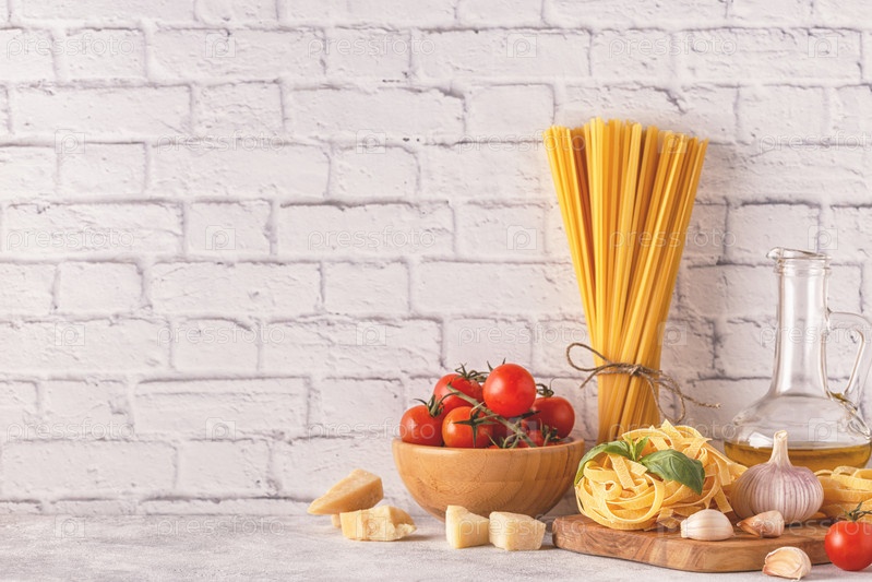 Продукты для приготовления - макароны, помидоры, чеснок, оливковое масло, базилик