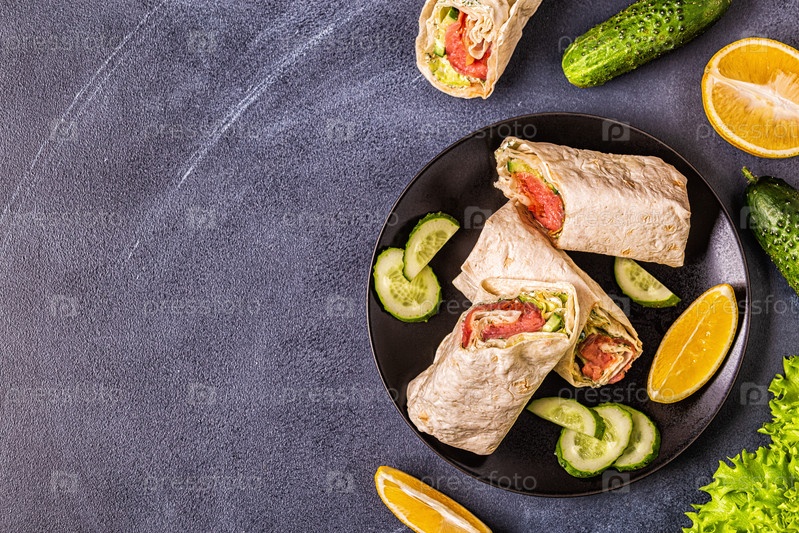 Завернутый сэндвич с лососем, листьями салата, огурцом и сливочным сыром