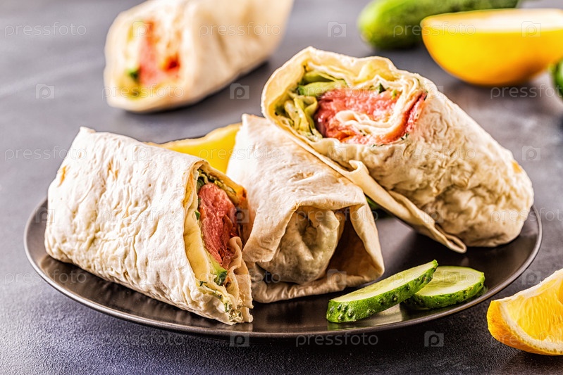Завернутый сэндвич с лососем, листьями салата, огурцом и сливочным сыром