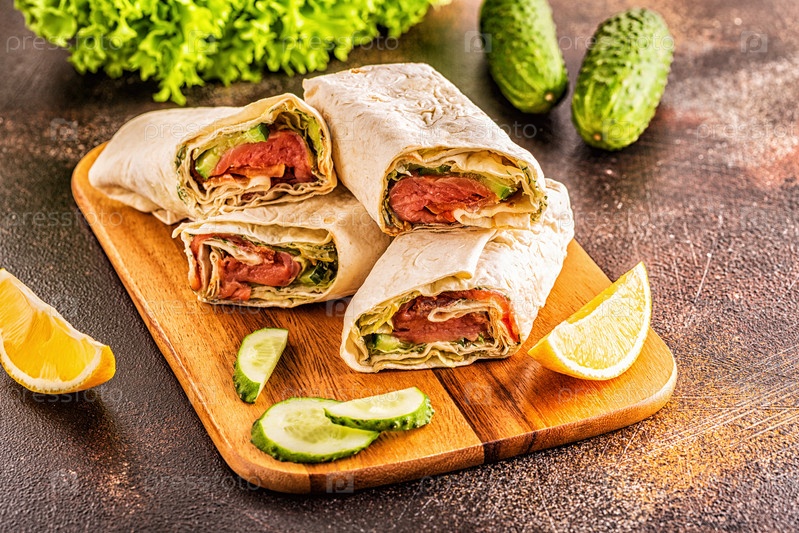 Завернутый сэндвич с лососем, листьями салата, огурцом и сливочным сыром