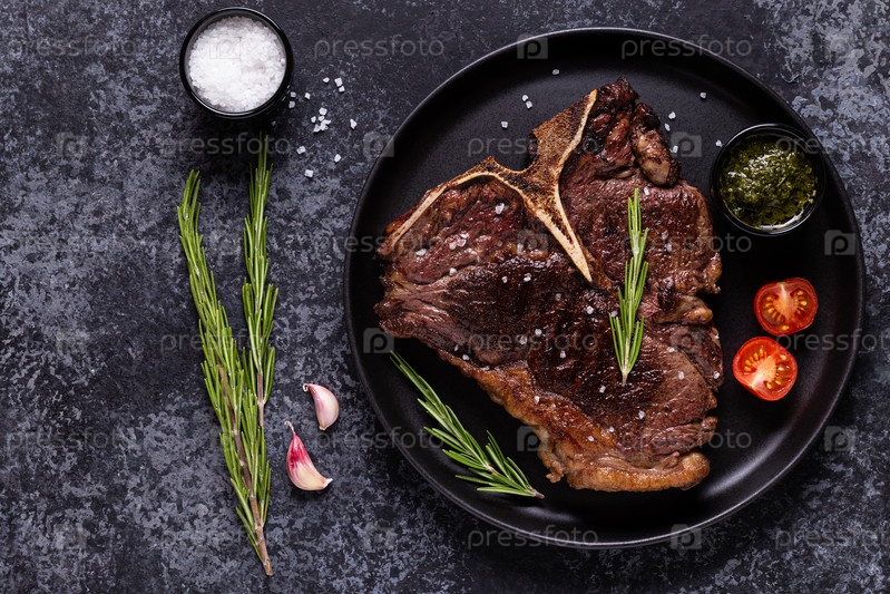 Стейк из говядины на гриле со специями на черной тарелке
