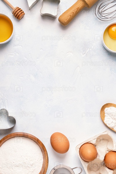 Ингредиенты для выпечки - мука, деревянная ложка, яйца