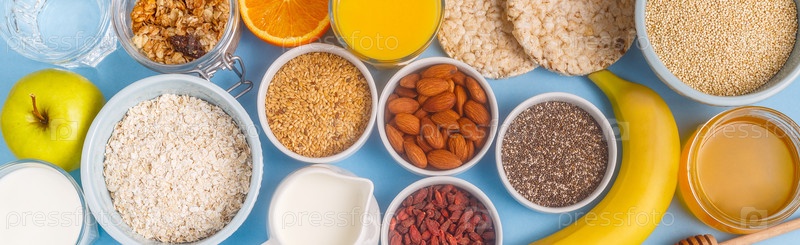 Полезный завтрак на синем пастельном фоне
