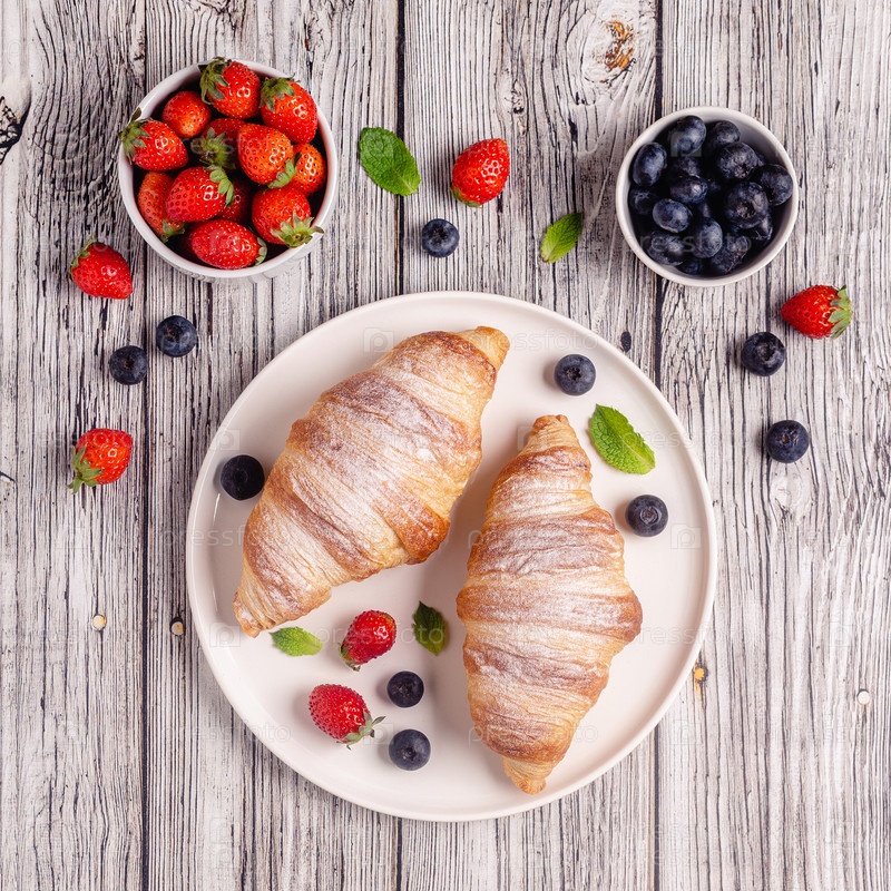Завтрак с круассанами и свежими фруктами