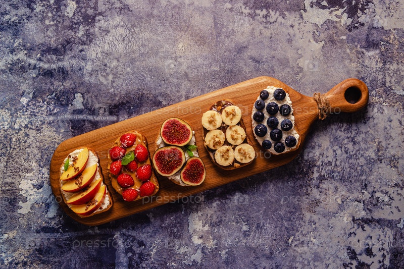 Домашний летний тост со сливочным сыром, ореховым маслом и фруктами и ягодами
