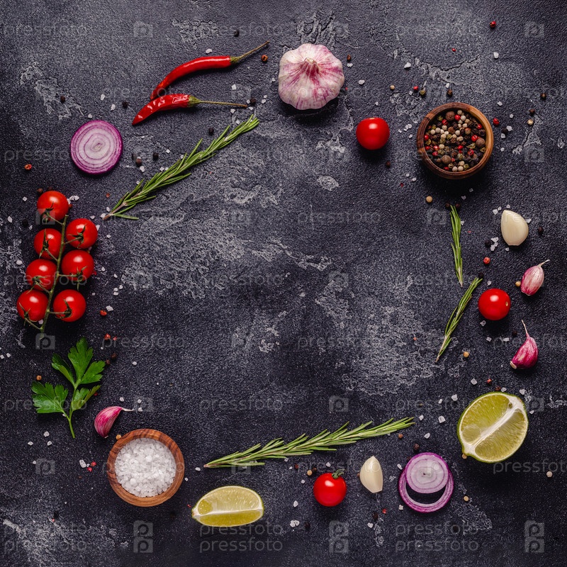 Травы и приправы на фоне черного камня