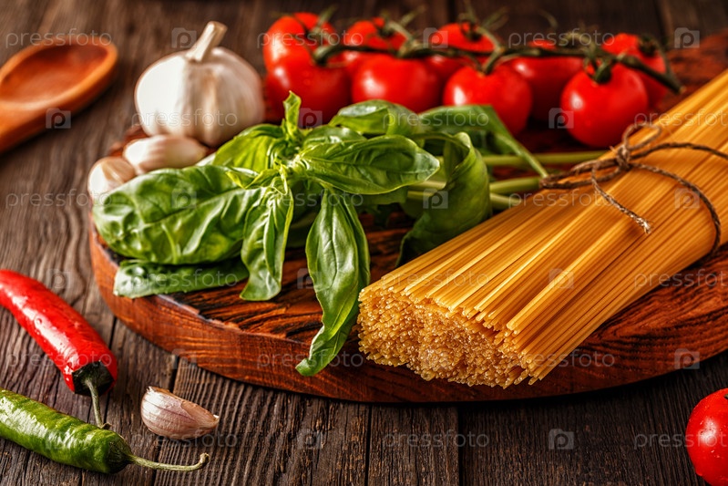 Продукты для приготовления пищи - макароны, помидоры, чеснок, перец и базилик