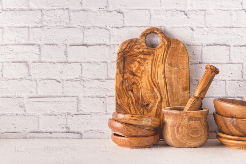 Деревянная посуда на белом столе