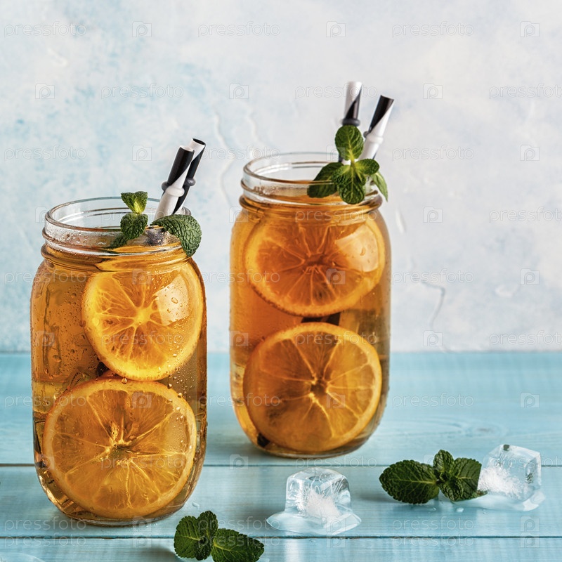 Холодный чай с дольками лимона и мятой