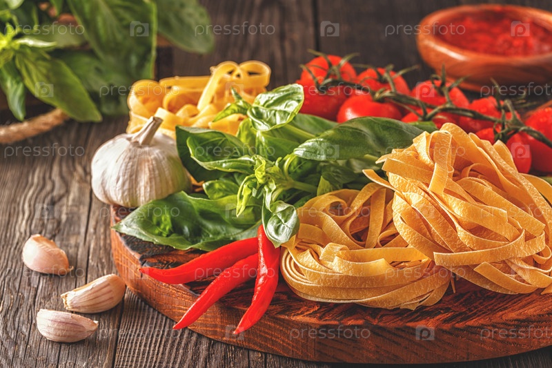 Продукты для приготовления пищи - макароны, помидоры, чеснок, перец и базилик