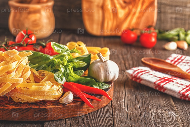 Продукты для приготовления пищи - макароны, помидоры, чеснок, перец и базилик