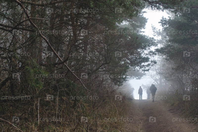 Туристы идут по горной дороге в тумане