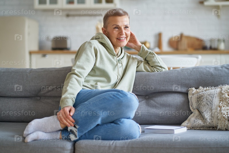 Красивая зрелая женщина в повседневной одежде мечтает о чем-то, отдыхая дома на диване