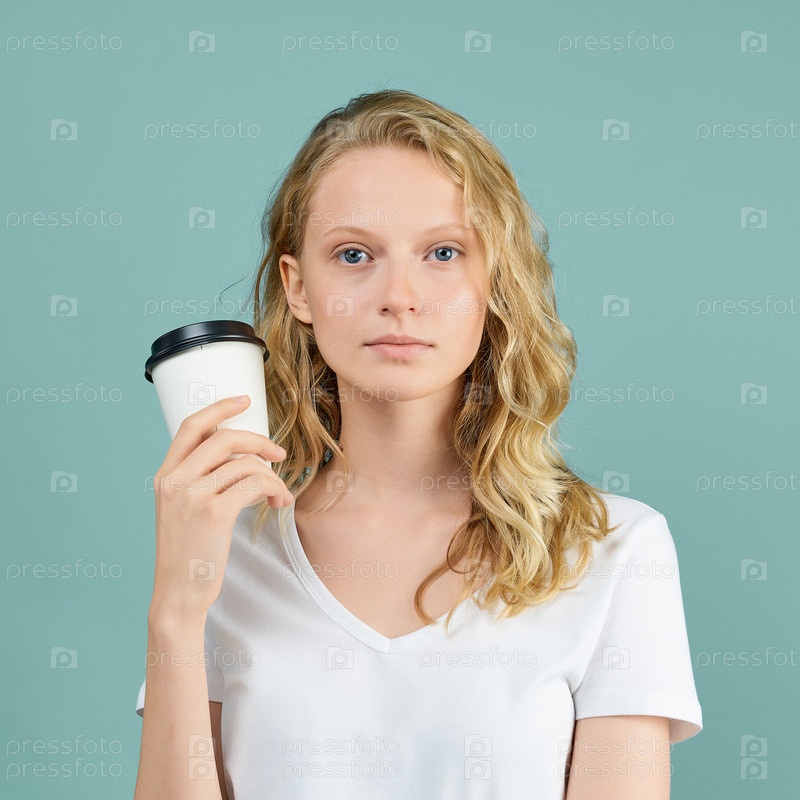 Портрет молодой студентки с чашкой кофе на ярко-синей зеленой стене Aqua Mint
